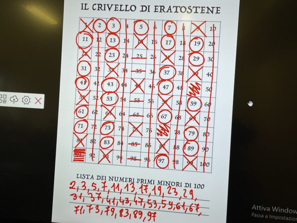 Questo algoritmo, che deve il nome al matematico Eratostene di Cirene, permette di “setacciare” i numeri primi, nel nostro caso minori di 100, proprio come si usa il setaccio per separare la farina dalla crusca. Così gli alunni, ciascuno con il proprio foglio e seguendo le indicazioni del professore alla LIM, hanno iniziato a cancellare tutti i multipli di 2, di 3, e così via…fino a rimanere con i soli numeri primi!