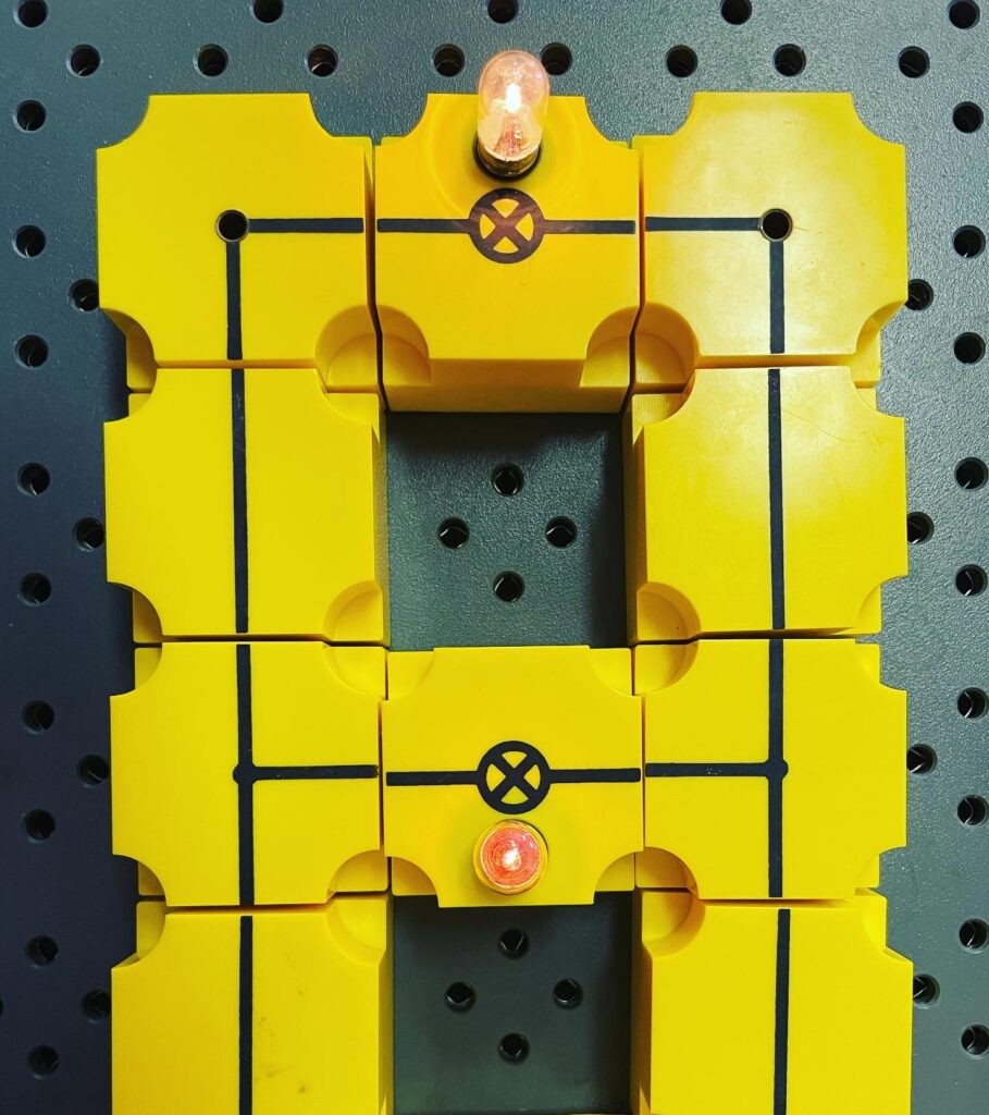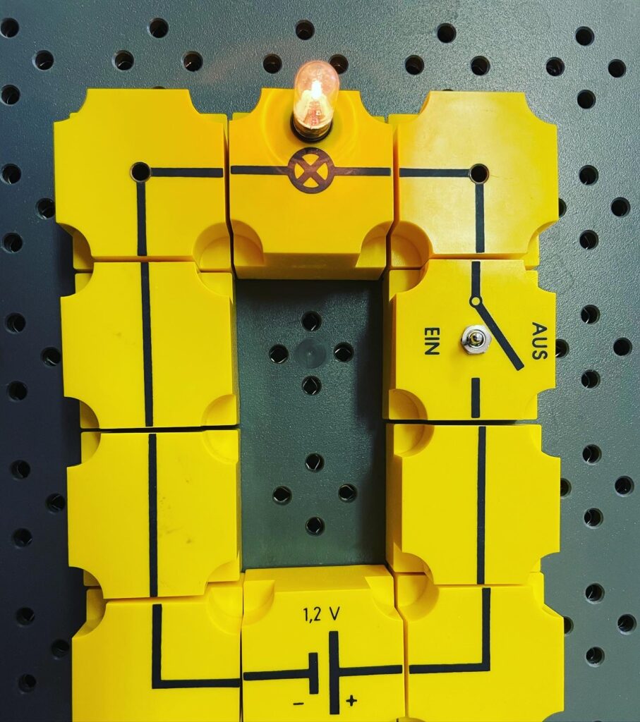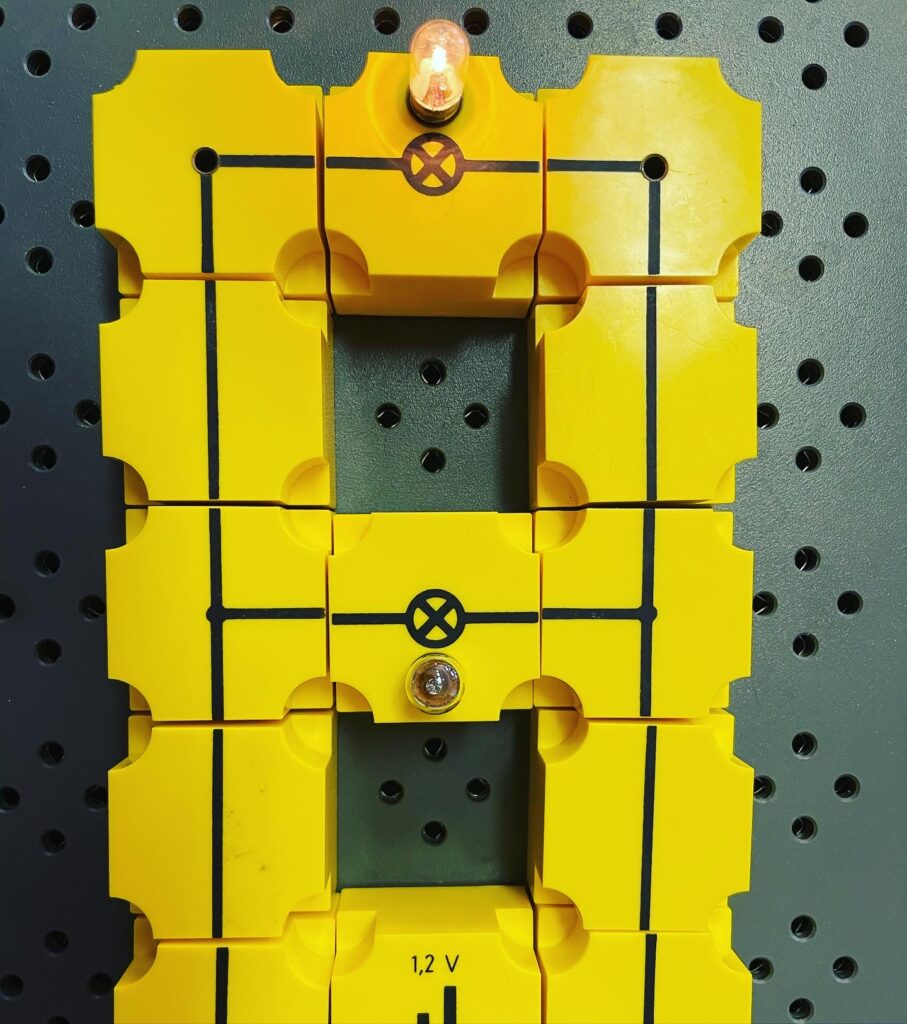 Mettendo insieme i pezzi gli alunni hanno potuto costruire diversi circuiti: un circuito in serie con una sola lampadina e un interruttore per verificare che la corrente passa solamente quando il circuito è chiuso.