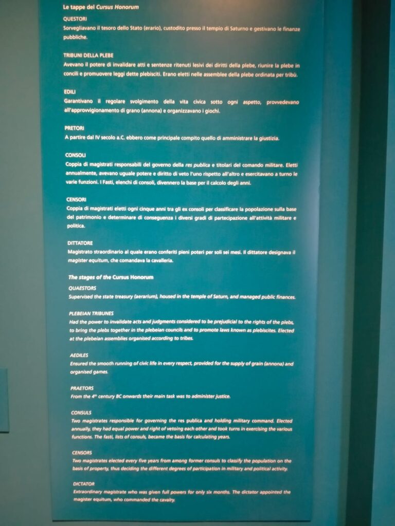 Nella mostra, inoltre, gli studenti hanno avuto modo di conoscere le caratteristiche delle magistrature romane: collegiali, e di durata limitata, in prevalenza annuale. Con l’avvento della Repubblica i poteri, in precedenza concentrati nella figura del re, erano stati distribuiti tra il pontefice massimo, cui spettavano le principali prerogative religiose, e i consoli, coppia di magistrati con competenze civili e comando militare. Per accedere al cursus honorum erano necessari, oltre a un censo minimo, fama e prestigio degli antenati: chi non apparteneva a poche illustri famiglie era un “uomo nuovo”. Le regole di ingresso alle magistrature e l’articolazione delle cariche subirono modificazioni nel tempo: l’accesso alle magistrature principali (consolato), inizialmente limitato ai membri delle famiglie patrizie, nel IV secolo a.C. fu esteso ai plebei. Con il progressivo aumento della potenza di Roma, si istituirono altre magistrature elettive con competenze circoscritte.