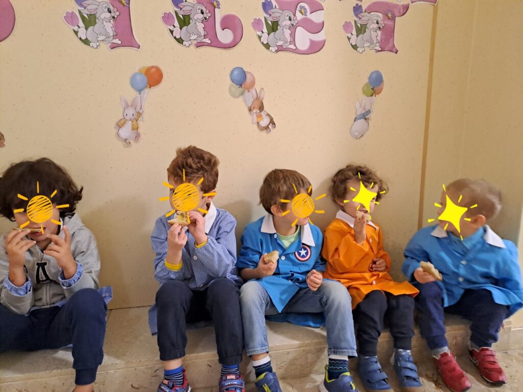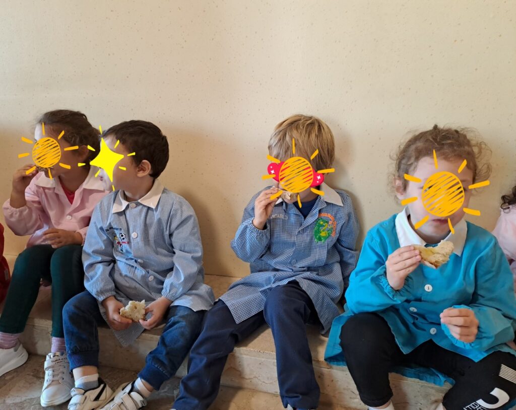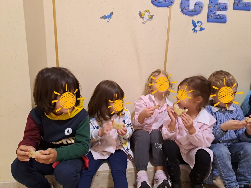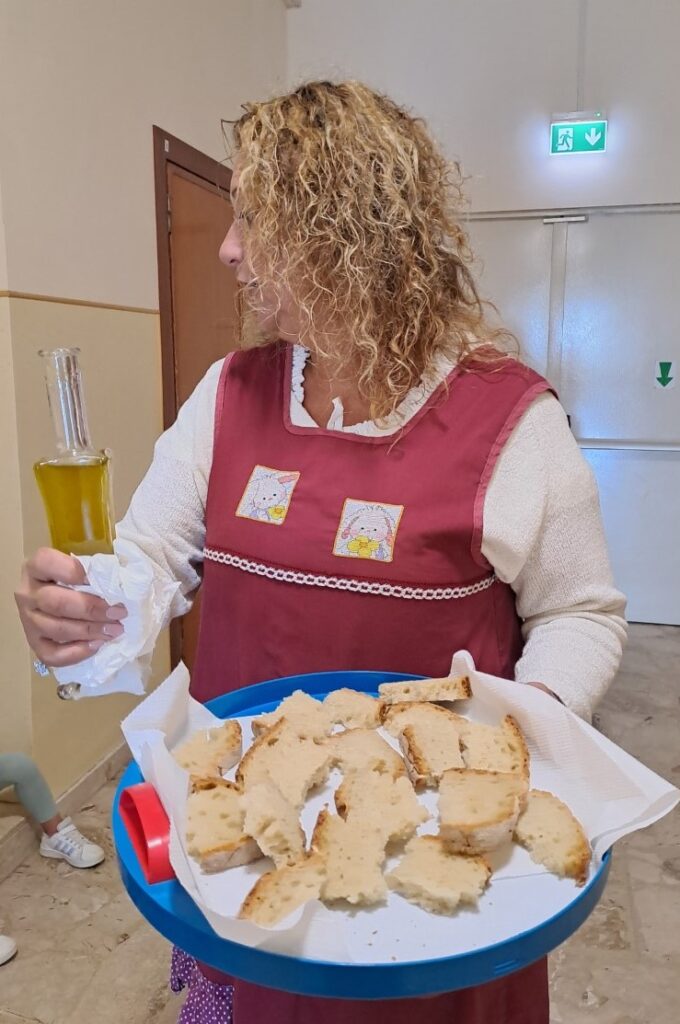 I bambini hanno assaggiato il pane tostato con l’olio ricavato dalla raccolta delle olive che il nostro giardiniere, Costantino, ha portato dal frantoio.