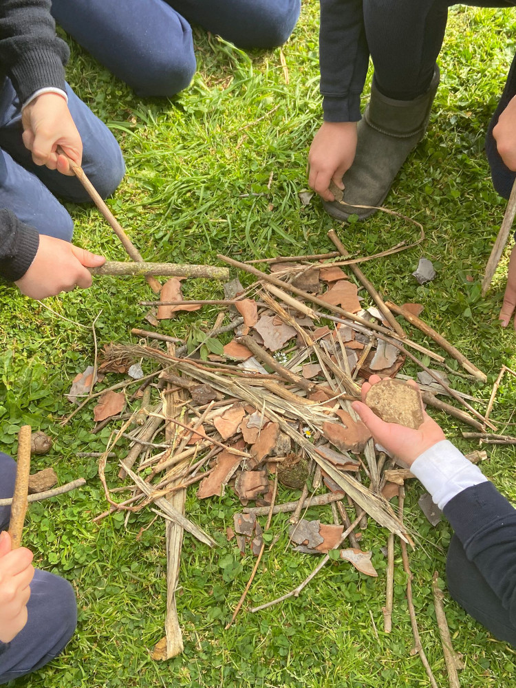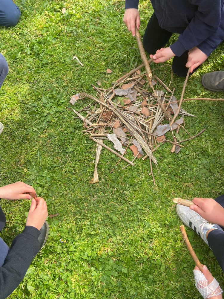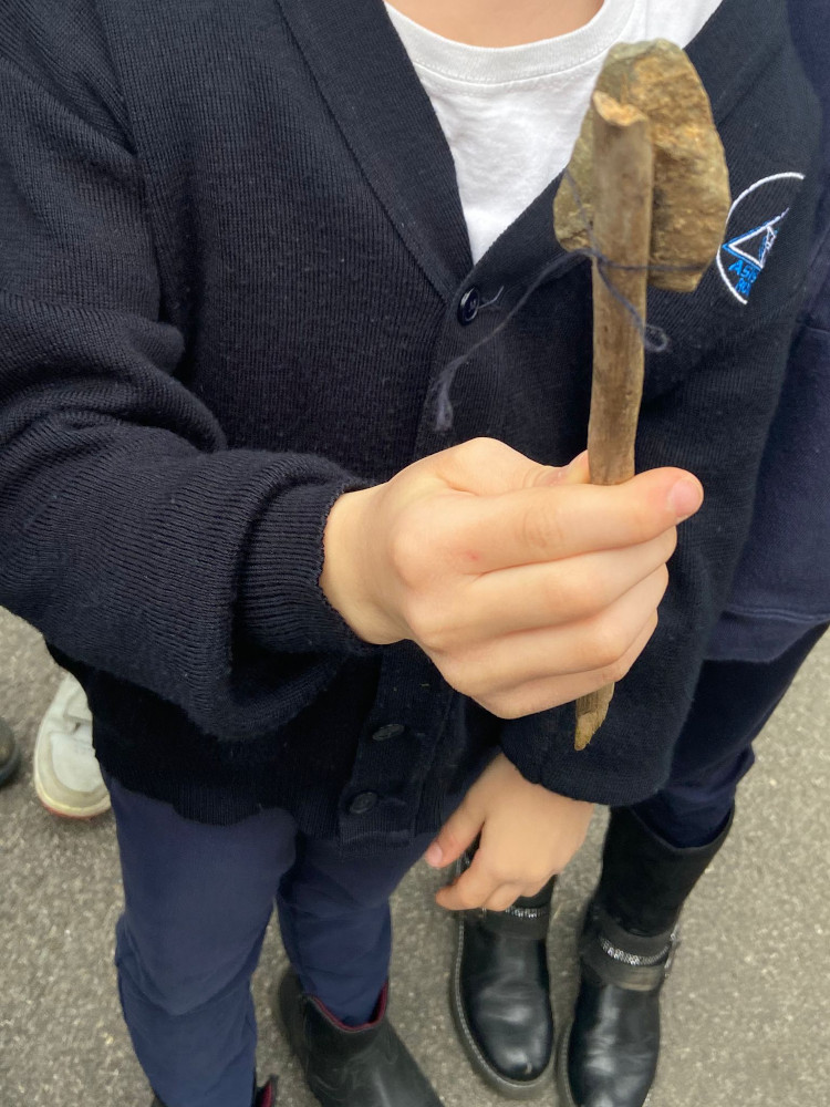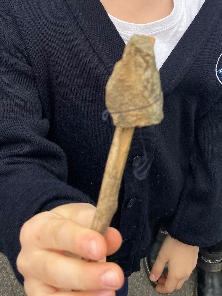 Ma nel Neolitico si realizzavano anche delle armi…così i bambini delle terze sono usciti nel parco a cercare dei rami e delle pietre (che ricordavano le pietre chopper utilizzate dai primi ominidi) per costruire delle rudimentali armi!