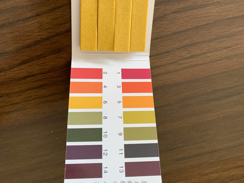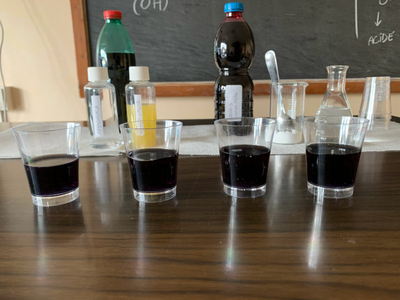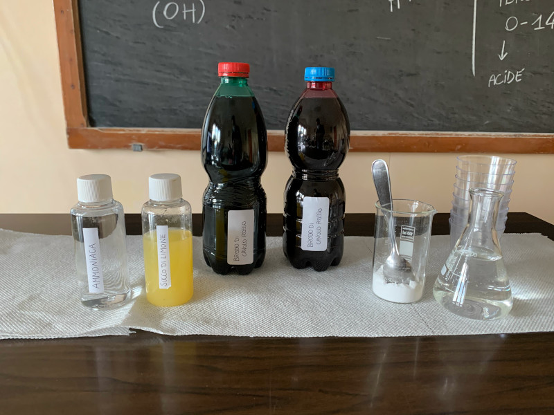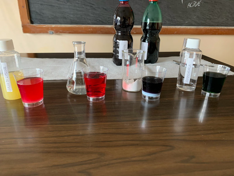 Con questo brodo di cavolo rosso gli alunni hanno misurato il pH di due sostanze acide: il succo di limone e l’aceto di alcol (che hanno fatto virare il colore del brodo sul rosso); successivamente hanno misurato il pH di due sostanze basiche: il bicarbonato di sodio e l’ammoniaca (che hanno fatto virare il colore del brodo sul verde).